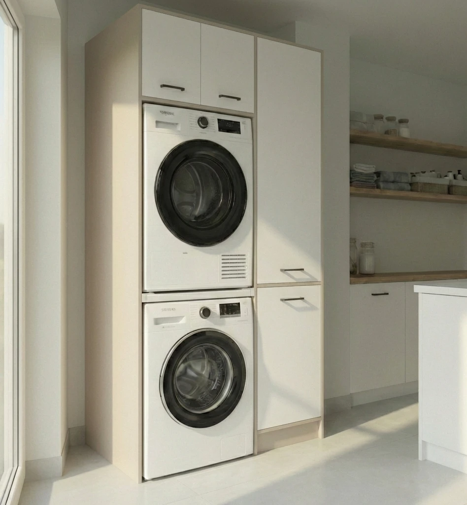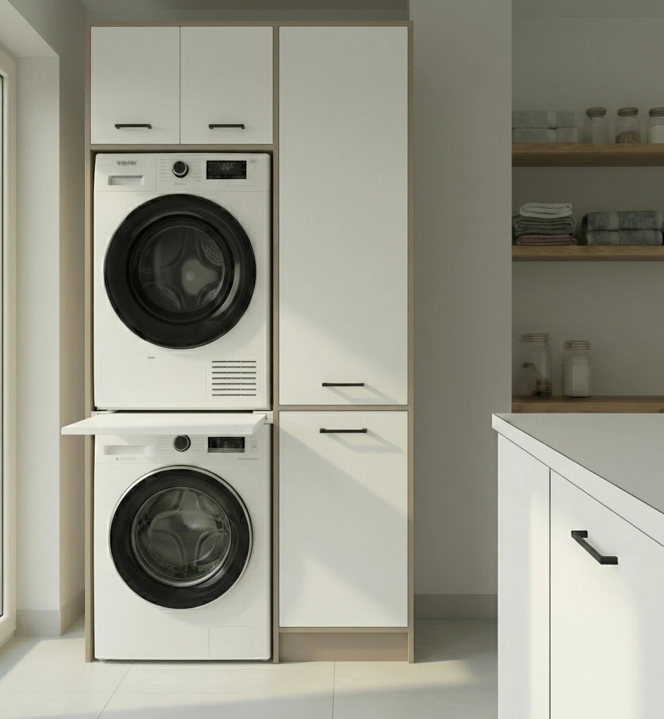 Konstrukcja umożliwia ustawienie pralki i suszarki w pionie, dzięki czemu zyskujesz więcej miejsca oraz uporządkowaną i funkcjonalną przestrzeń. Połączenie eleganckiego koloru Kaszmir z białymi frontami nadaje meblowi lekki, nowoczesny charakter.