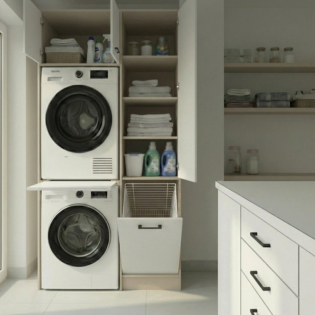 Zawiasy z cichym domykiem zapewniają komfortowe i bezgłośne użytkowanie, a przemyślany układ półek i szafek pozwala utrzymać porządek w każdej pralni.