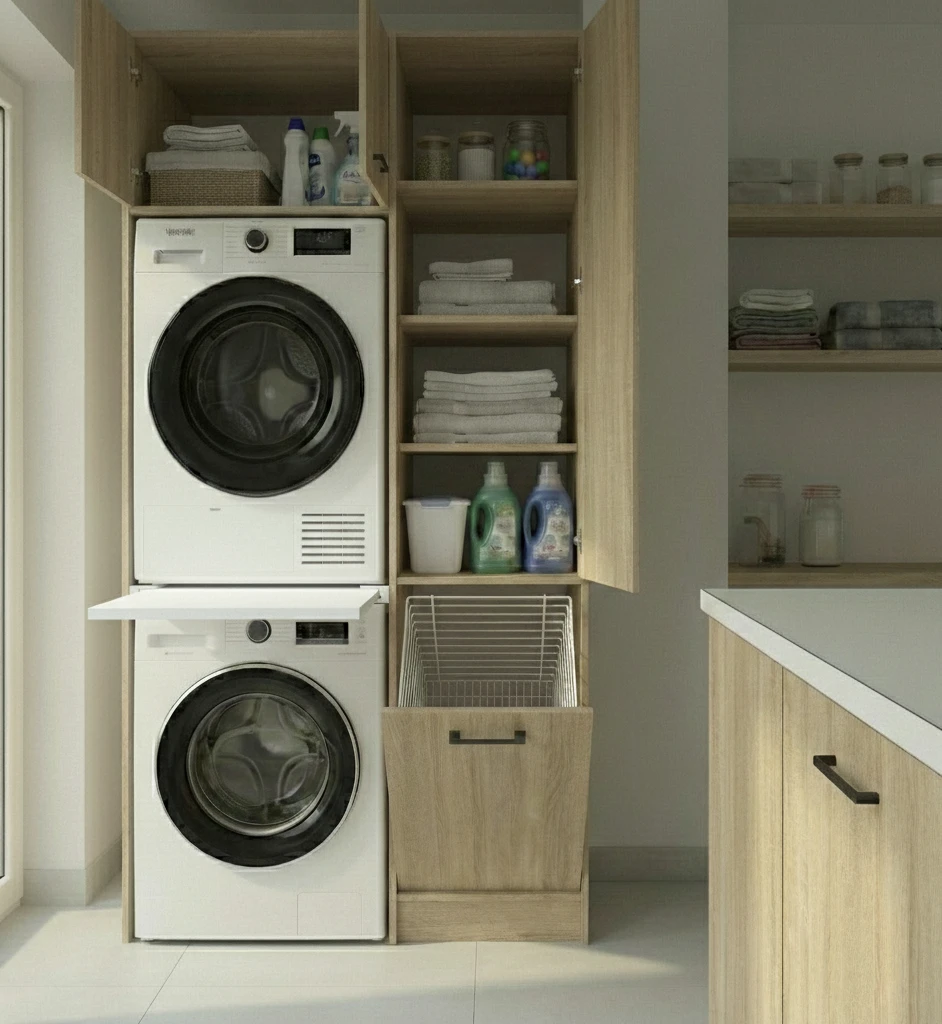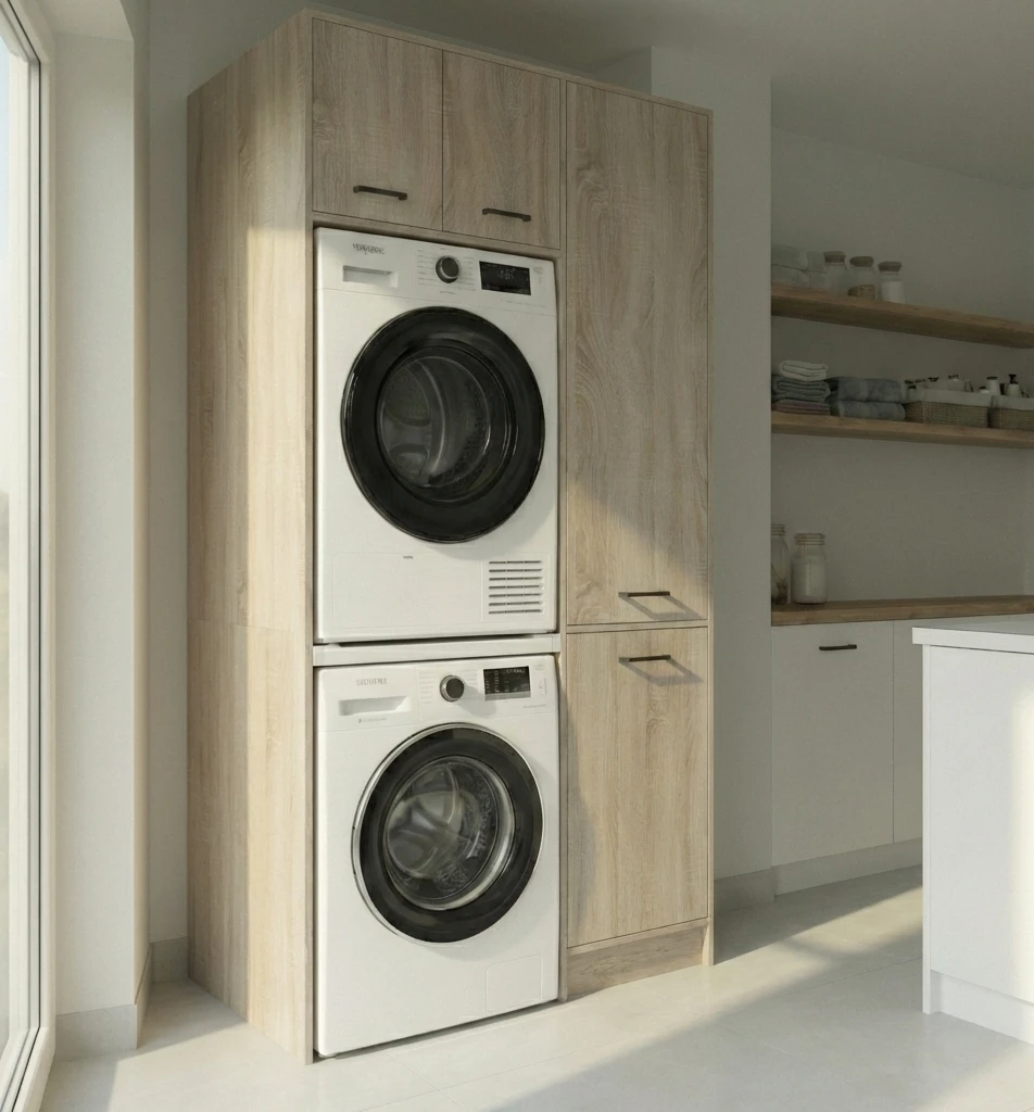 Nowoczesny regał do pralni, który pozwala ustawić pralkę i suszarkę w słupku i odzyskać cenne miejsce w pomieszczeniu. Idealne rozwiązanie do mniejszych łazienek i pralni, gdzie liczy się każdy centymetr.