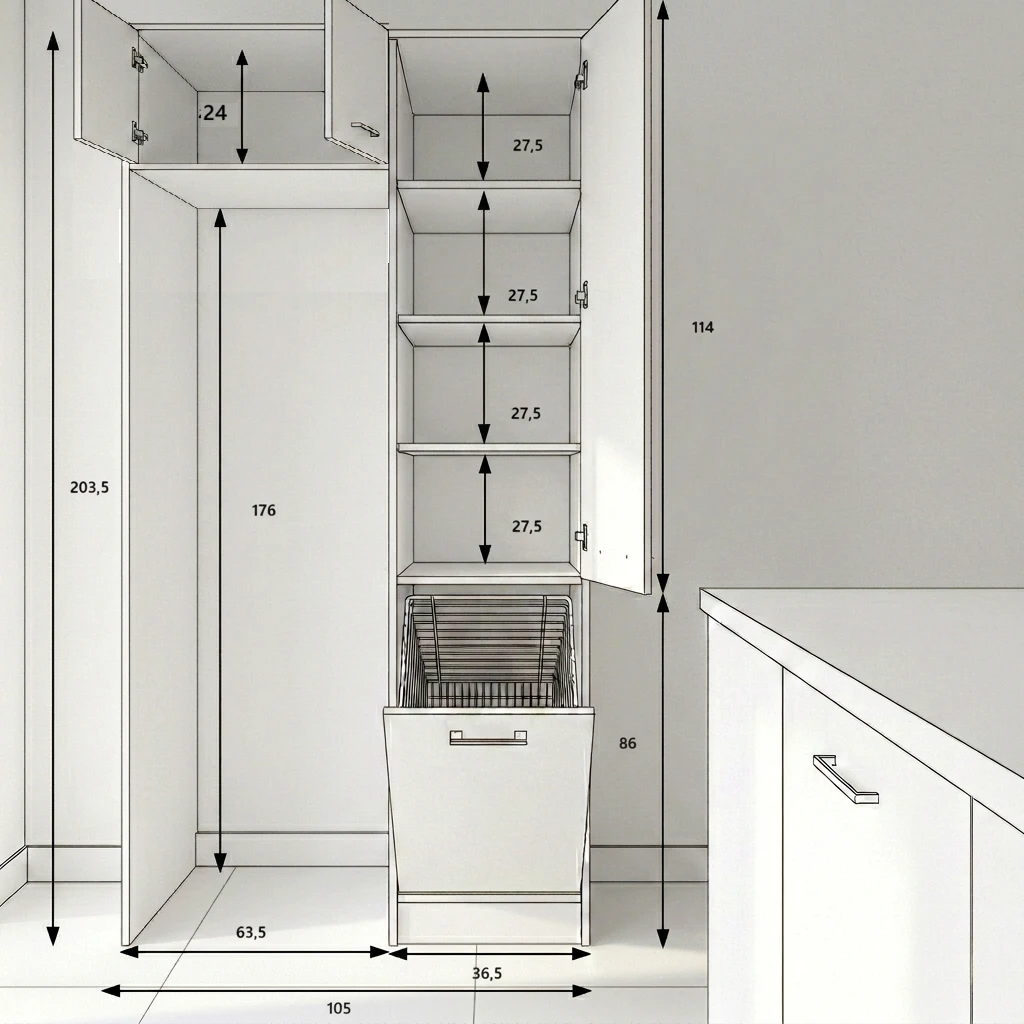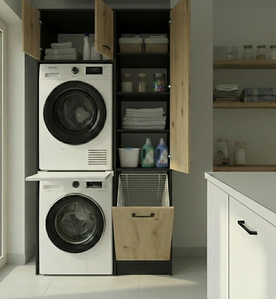 Przemyślana konstrukcja: 4 półki boczne, zamykane szafki oraz kosz na pranie – wszystko w jednym miejscu, zawsze pod ręką i bez bałaganu.