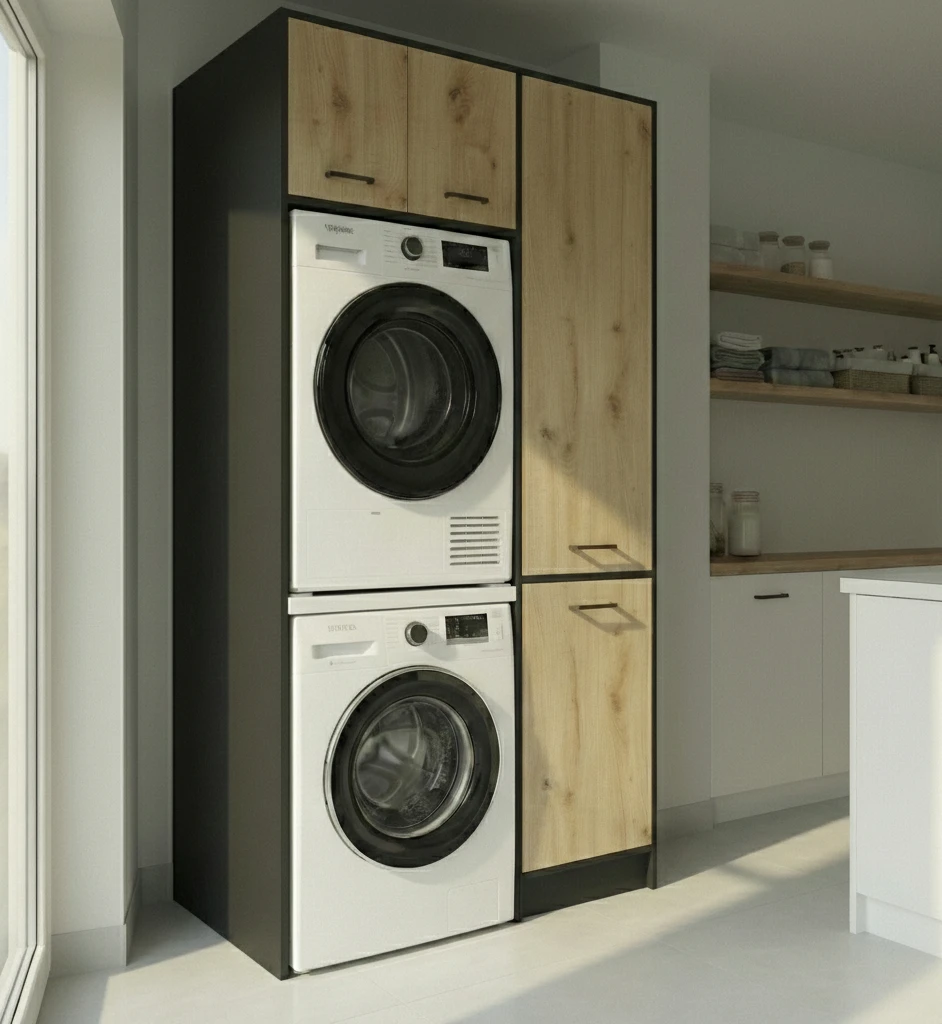 Konstrukcja umożliwia ustawienie pralki i suszarki w pionie, co pozwala zaoszczędzić miejsce i stworzyć wygodną strefę pralnianą. Połączenie czarnego korpusu z frontami w kolorze dąb Artisan nadaje meblowi elegancki, ocieplony drewnianym dekorem wygląd.