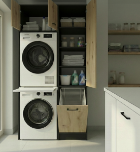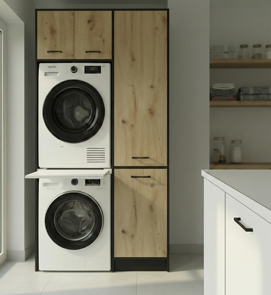 Nowoczesny regał do pralni, który pozwala ustawić pralkę i suszarkę w słupku i odzyskać cenne miejsce w pomieszczeniu. Idealne rozwiązanie do mniejszych łazienek i pralni, gdzie liczy się każdy centymetr.