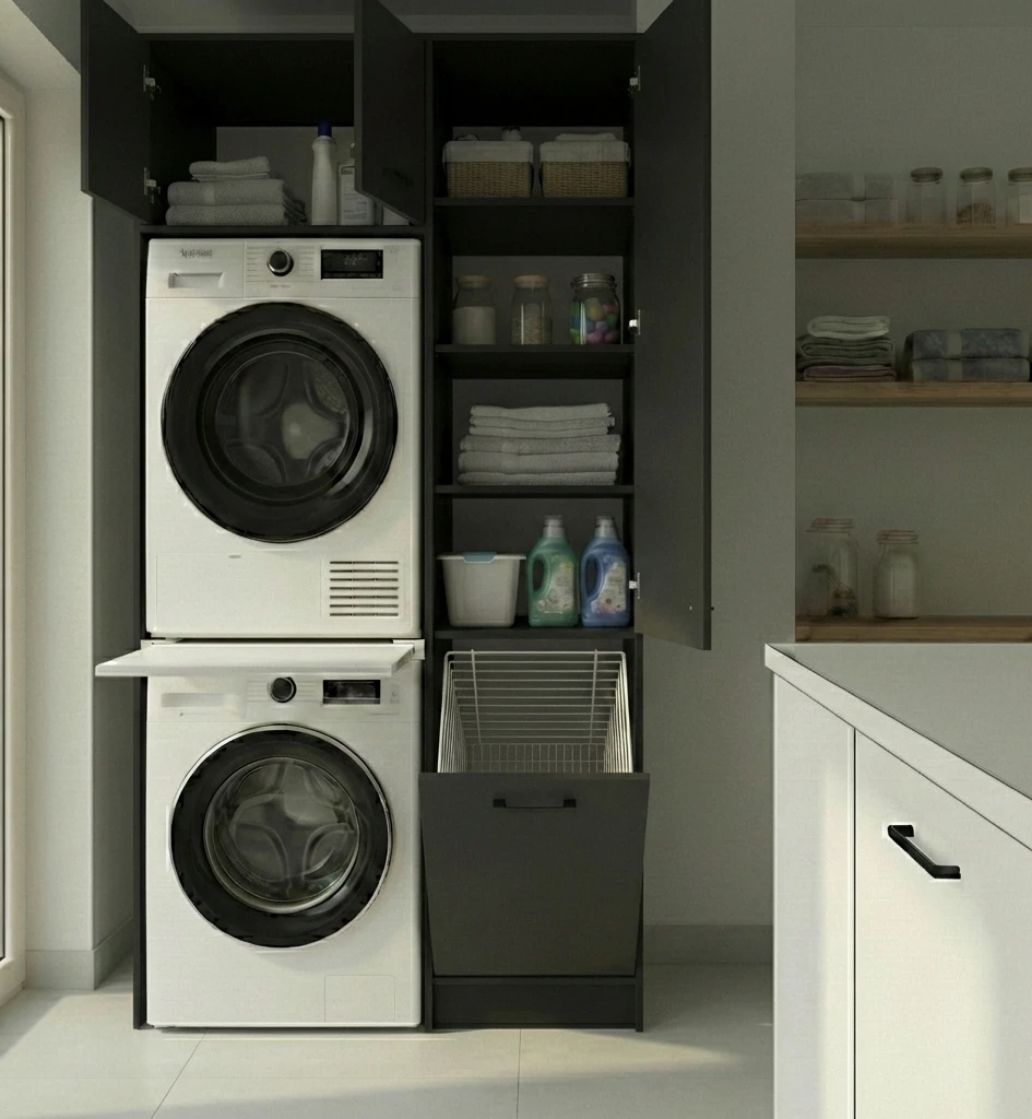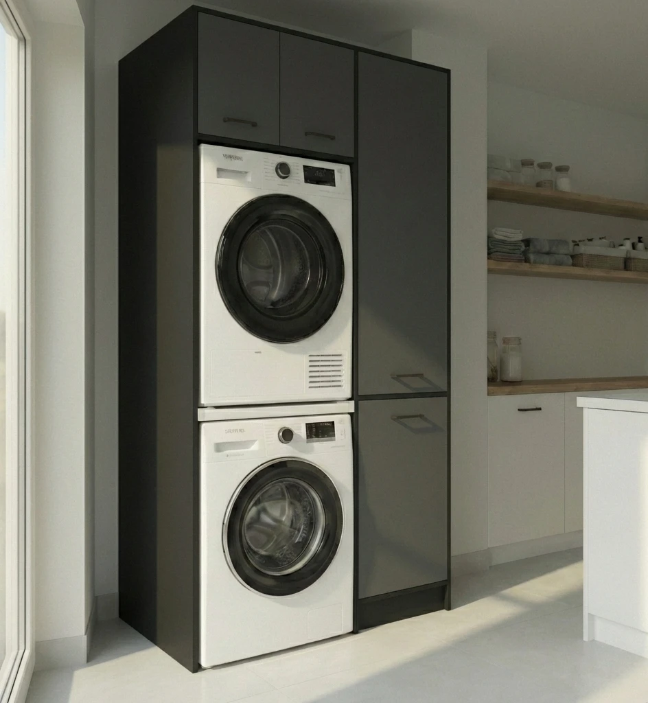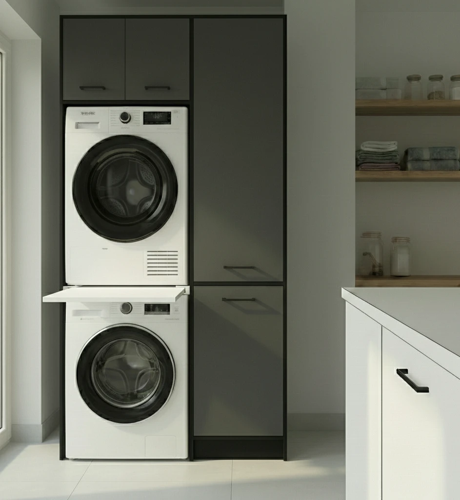 Nowoczesny regał do pralni, który pozwala ustawić pralkę i suszarkę w słupku i odzyskać cenne miejsce w pomieszczeniu. Idealne rozwiązanie do mniejszych łazienek i pralni, gdzie liczy się każdy centymetr.