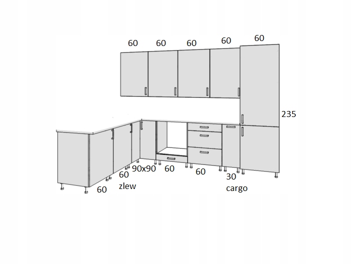 Szafki górne , wysokość 90 cm , głębokość 30 , otwierane na bok , w środku półki .