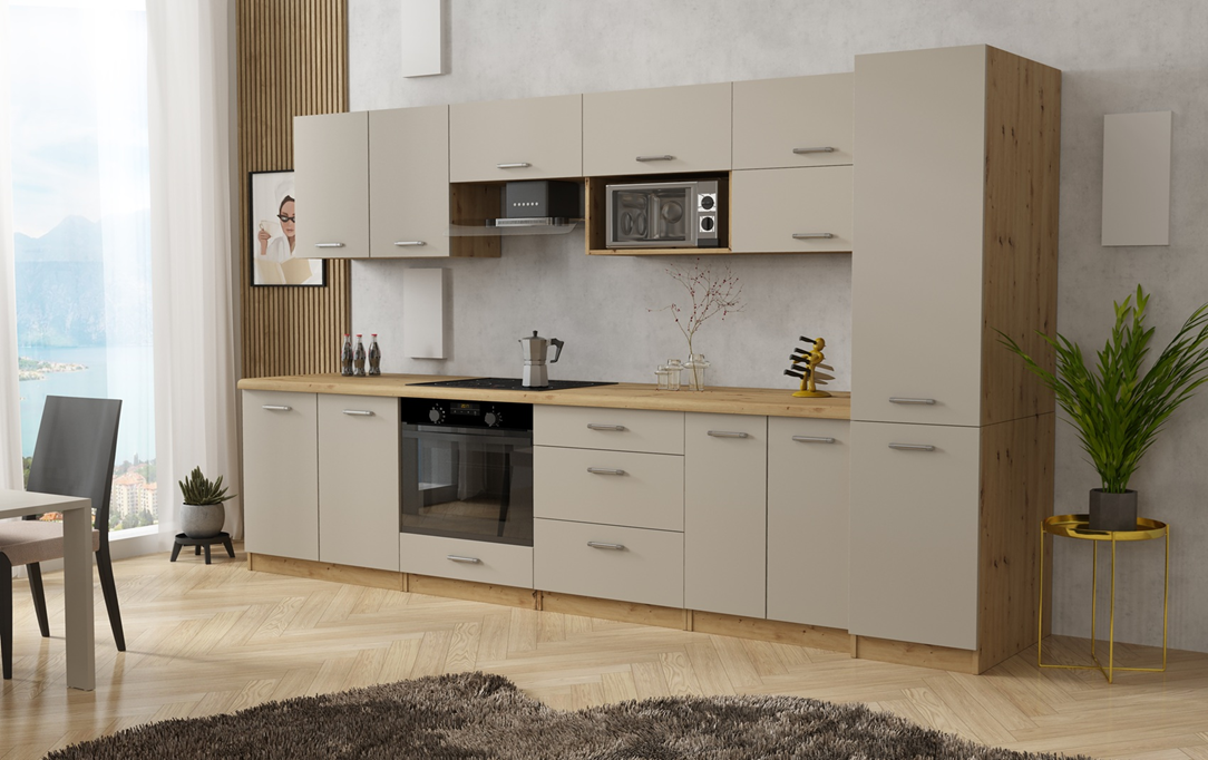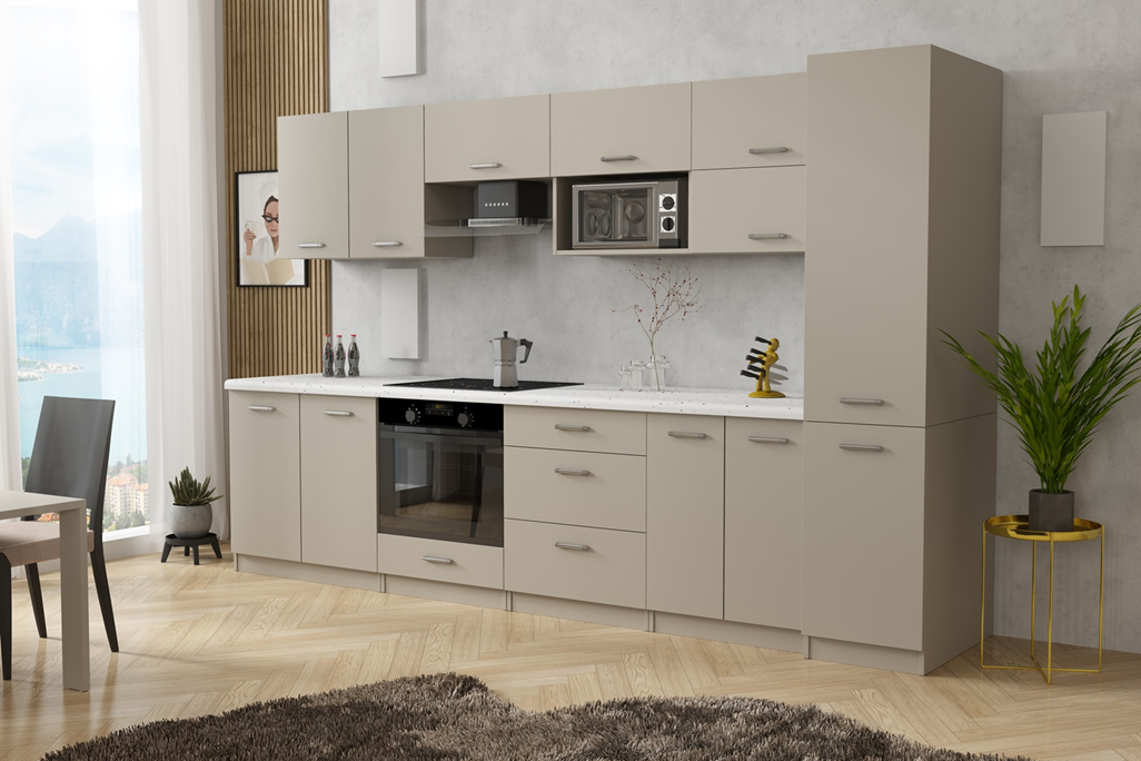Meble kuchenne KUBA 5 - zestaw 8 szafek (4 górne + 4 dolne) -kaszmir / andromeda biała - blat 260 cm + wysoki słupek kuchenny - Zmontowane