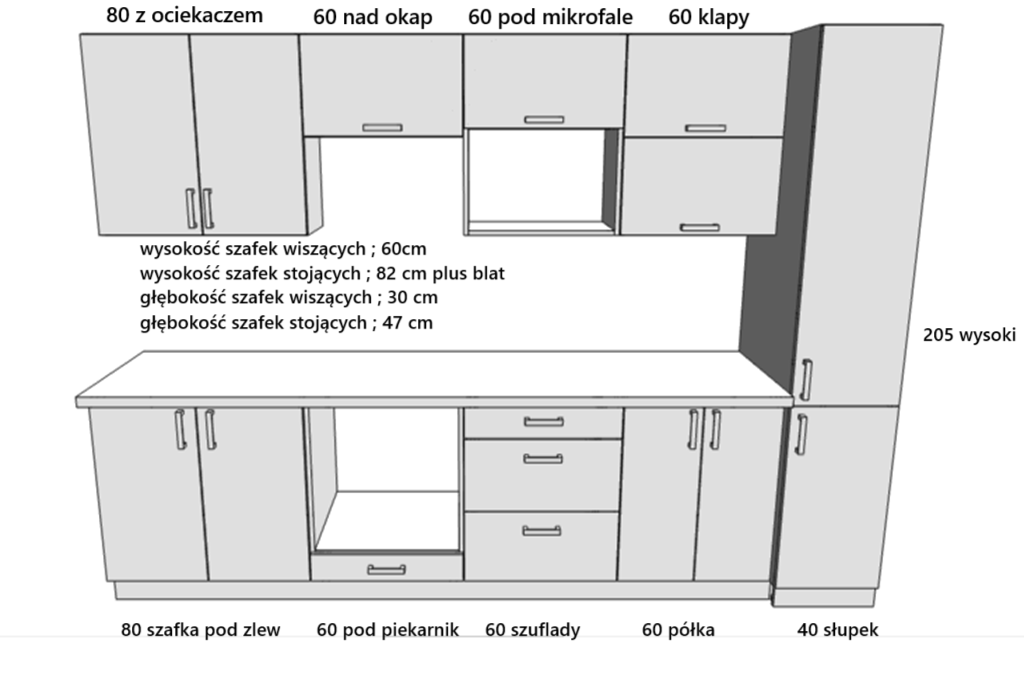 - ✔ 4 szafki wiszące (w tym na mikrofalówkę)