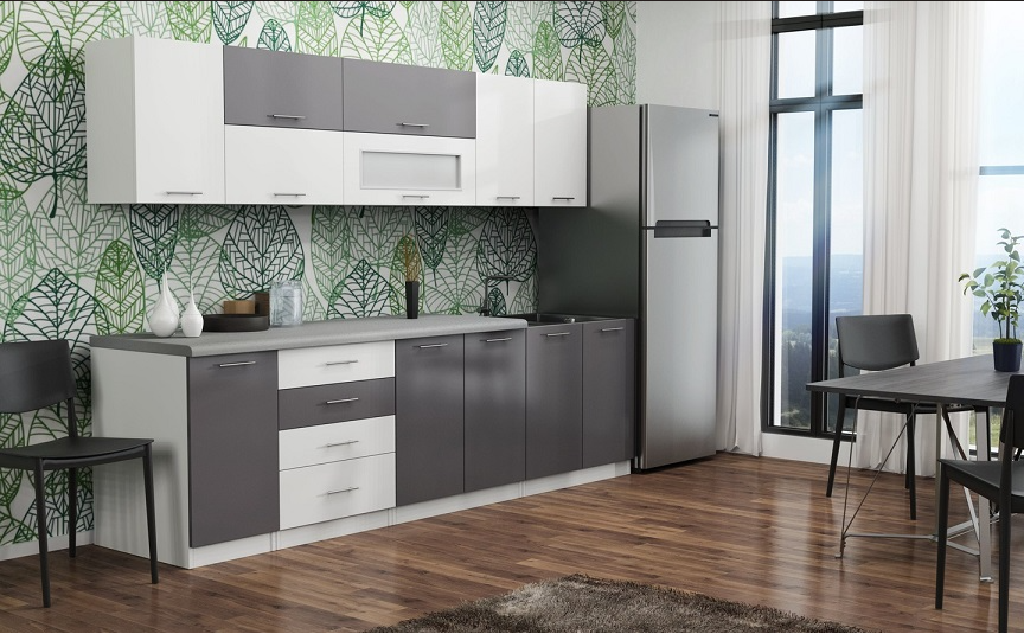 Zestaw mebli kuchennych FRESCO A4 260 cm – grafit + biały połysk – dostawa skręconych szafek
