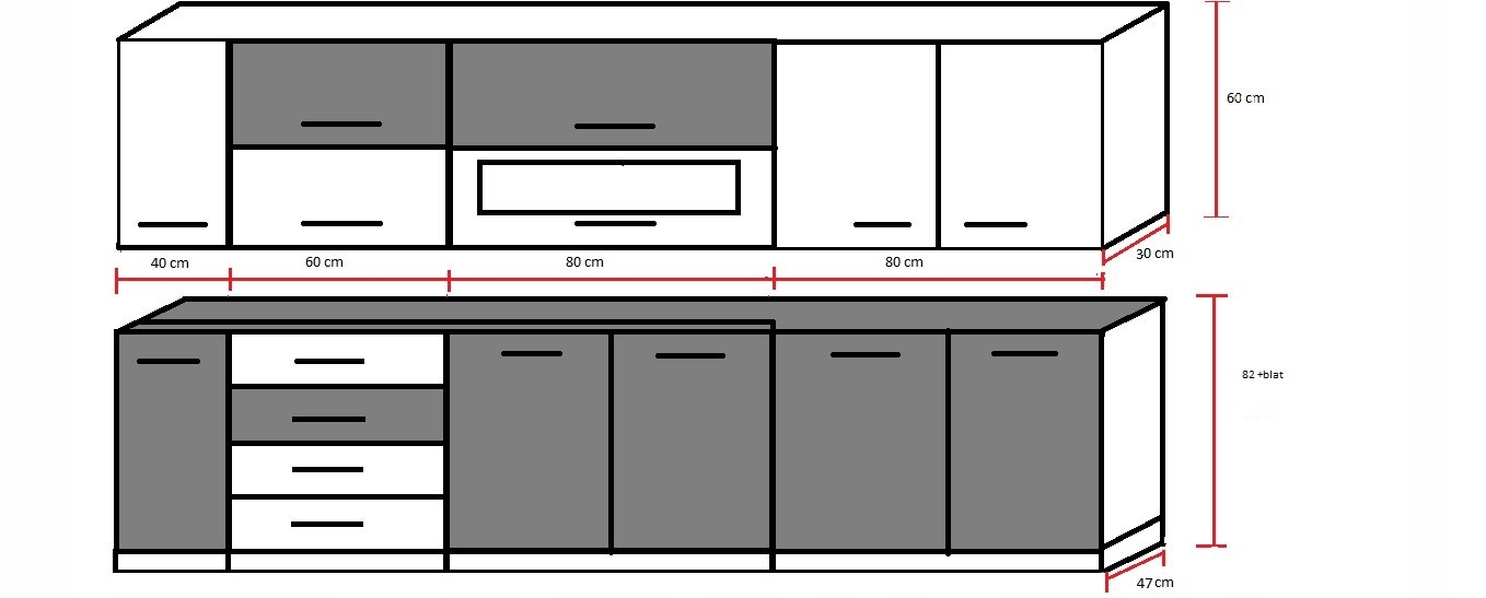 - ✔ 4 szafki dolne (z miejscem na zlew i szuflady)